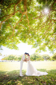 ハワイ現地に素敵なサロンがあり、事前の衣装チェックでは3着ほど着てお店の方と相談しながら気にいるドレスが見つかりました。新郎の衣装も新婦の衣装と合った素敵なものがありました。